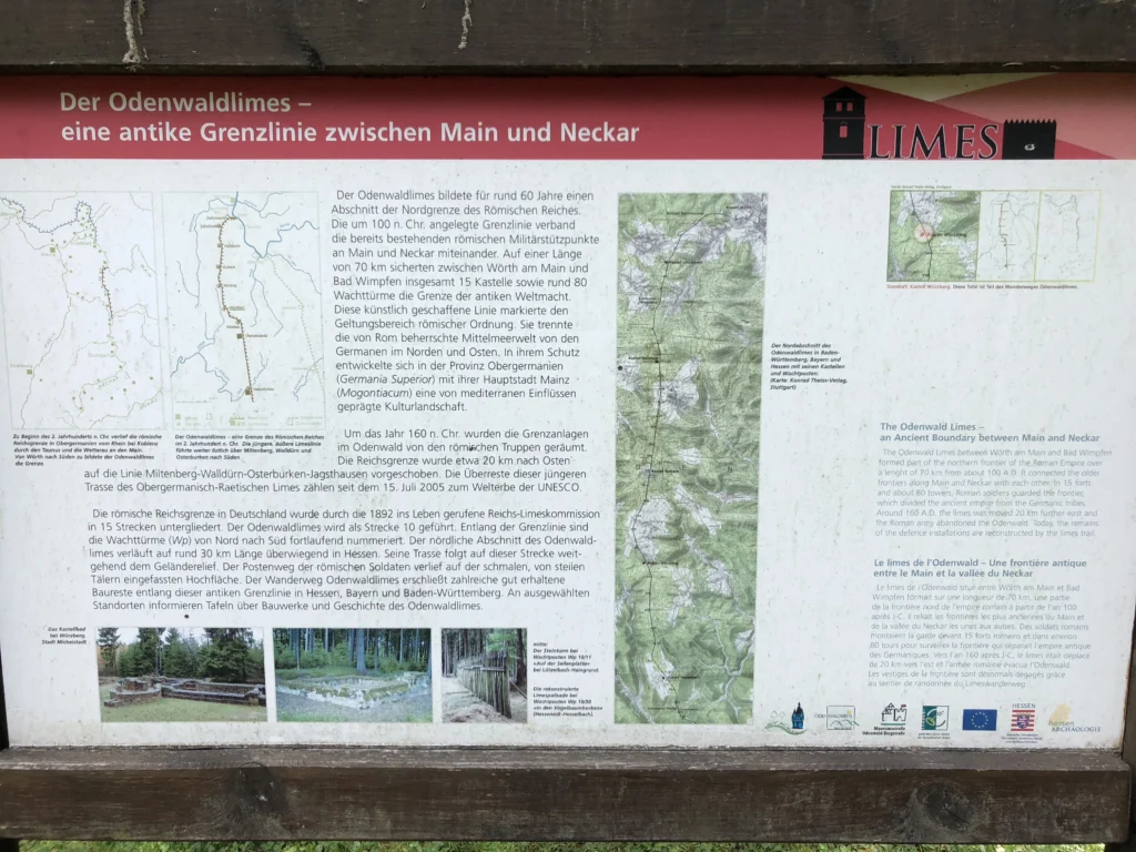Das Numeruskastell ist aber überhaupt nicht ausgeschildert, zumindest nicht von der Seite von der wir es angefahren haben. Geparkt haben wir auf einem Schotterparkplatz (N49.7827565/E9.0910846) im Wald bei einem Hundeverein.
